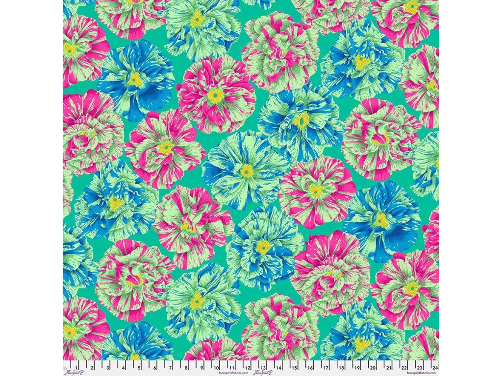Nádherný růžovo-modrý květinový vzor na zeleném pozadí z kolekce Kaffe Fasset Collective z února 2026.