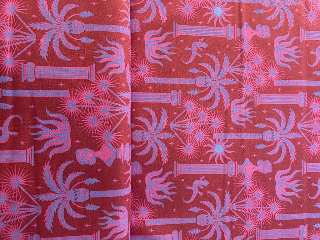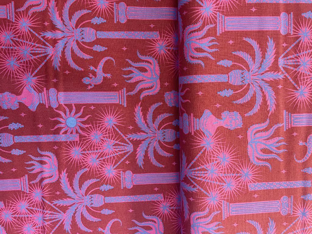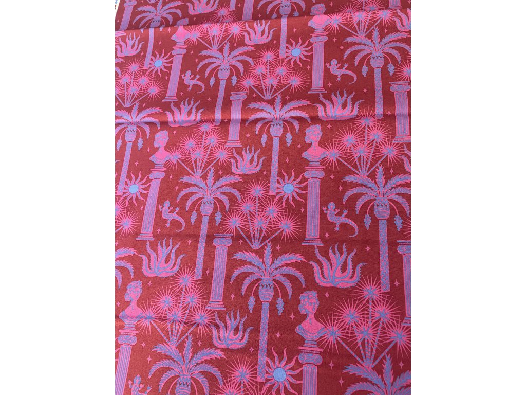 Nádherná zábavná látka plná tyrkysových palem, řeckých sloupů, gekonů a ohňostrojů na magenta pozadí.