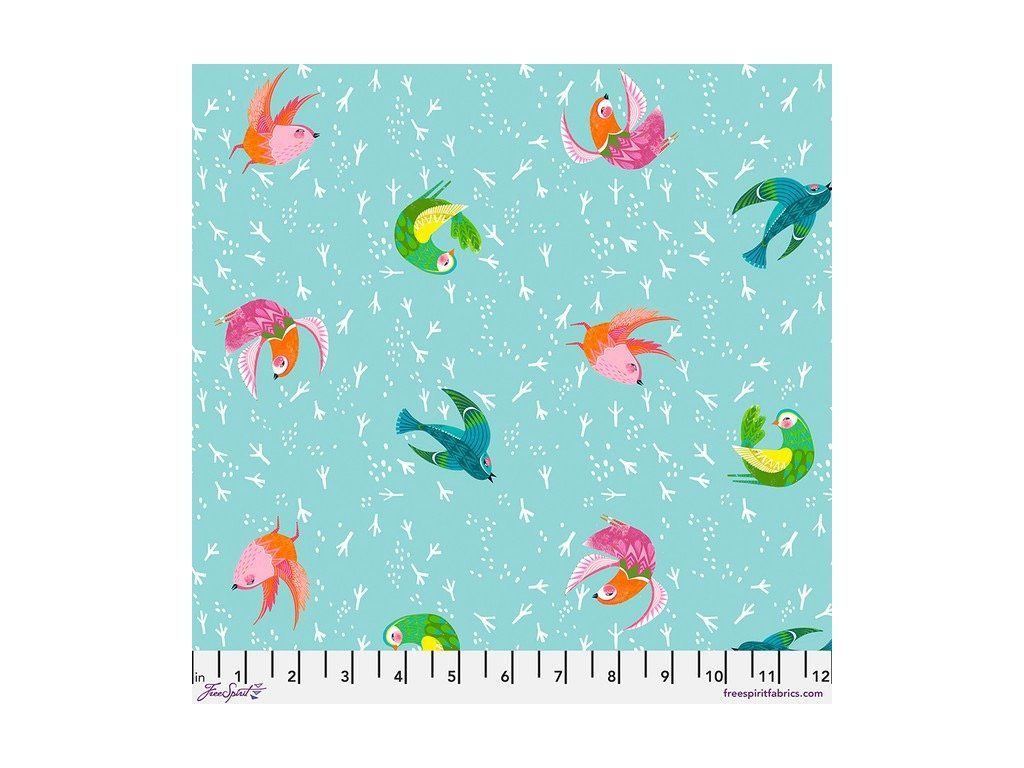 Nejnovější kolekce od Cori Dantini. Ptáčci skákající po modrozeleném pozadí posetém otisky ptačích drápů