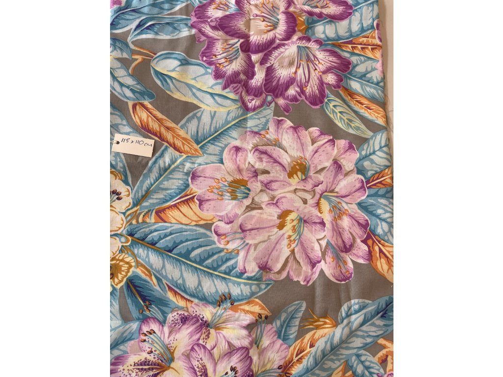 Další ze vzorů úžasného návrháře kytek Philip Jacob. 100% bavlněná látka, vzor modré lístky a růžový rododendron na šedém podkladě. Velmi jemné a vzdušné bavlněné plátno, vhodné na šití šatů, halenek, tunik, závěsů, polštářů...